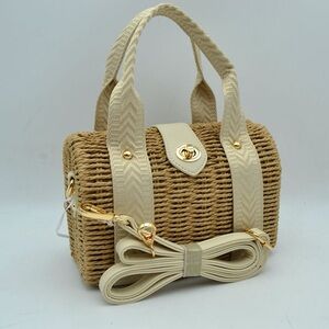 Chic woven straw handbag with cream straps and gold-tone hardware. Lightweight and versatile for everyday or casual outings. Secure turn-lock closure and detachable cream shoulder strap for hands-free wear. Neutral cream and natural tones pair easily with any outfit.