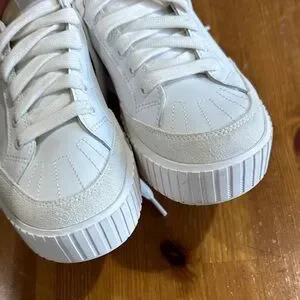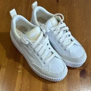 Sorel low-top sneakers in cream and white. Smooth leather and fabric upper. Padded collar and cushioned insole. Lace-up front and rubber outsole for traction.
