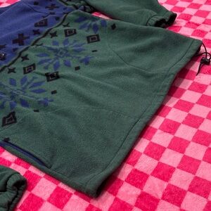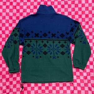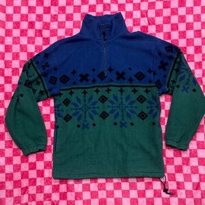 Comfortable men's zip-up sweater in blue and green with a classic fair isle pattern. Half-zip collar allows easy layering and adjustable coverage. Elastic cuffs and drawcord hem help lock in warmth. Versatile blue and green colorway for casual weekend or outdoor wear.