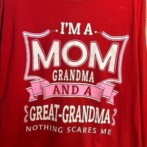 Introducing the Fruit Of The Loom Graphic Long Sleeve Cotton T-Shirt in size XL, celebrating the strength and humor of multi-generational motherhood. Featuring a bold graphic that reads "I'm A Mom Grandma and A Great Grand-Ma Nothing Scares Me," this red shirt exudes confidence and warmth. Crafted from soft cotton, it offers comfort and breathability, perfect for everyday wear. Whether worn alone or layered, this long sleeve tee adds a touch of personality and resilience to any outfit. Ideal for moms and grandmothers who embrace their roles with pride and a sense of humor.