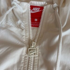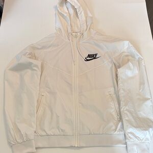 Lightweight hooded windbreaker. Full front zipper and zip pockets. Elastic cuffs and hem for a snug fit. Subtle Nike logo on chest.