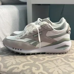 Classic Reebok silhouette in suede and leather. Neutral white base with taupe overlays and sage accents. Cushioned midsole for everyday wear. Lace-up closure for a secure fit.