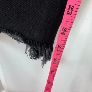 High-rise black denim with knee distressing. Frayed cropped hems for an edgy finish. Slim through the leg for a modern silhouette. Versatile style-forward denim.