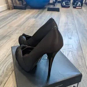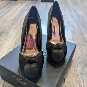 The heels feature a soft black satin upper with a knotted front detail, tall glossy stiletto heels, and a rounded platform toe for added height and comfort.