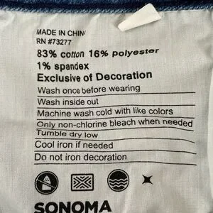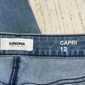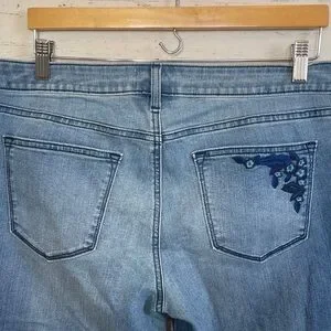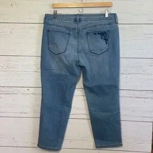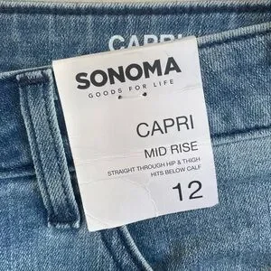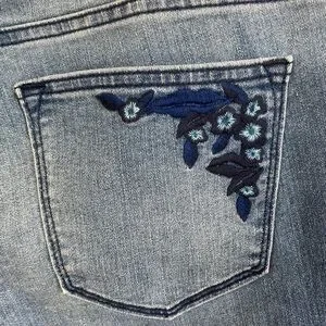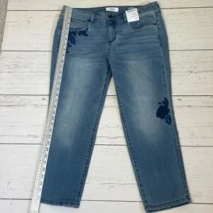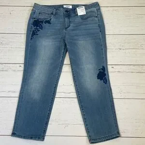 Sonoma Goods for Life Capri/Cropped Jeans with Embroidered Details in size 12. Mid rise, straight through hip and thigh. 5-pocket style. Light/medium wash with slight distressing. Pretty floral embroidered details in shades of blue on one back pocket, one lower leg, and below one front pocket. Very soft denim fabric with stretch. Measurements provided in photos. Brand new with tags.