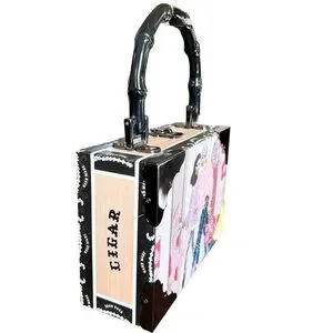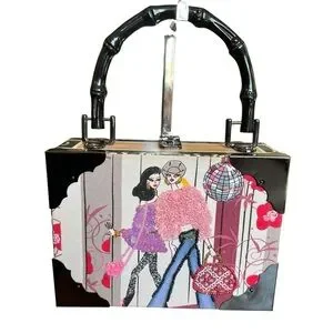 NWOT Chic box-style women’s cigar box bag with playful fashion illustration. Features pink accents and black handle for a bold contrast. Lightweight and eye-catching for daytime or evening wear. Stylish and fun addition to any outfit. 7.5”x5.5”x3”