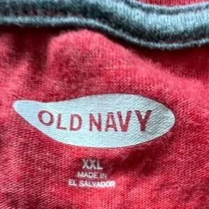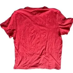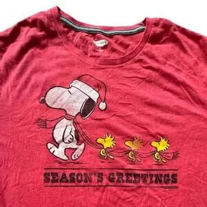 Old Navy red tee with Snoopy + Woodstock holiday graphic. Reads “Season’s Greetings.” Casual, festive, easy wear.
