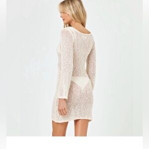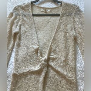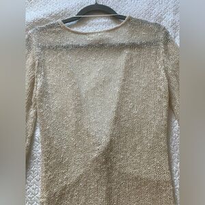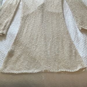 Stylish knitted cover-up with long-sleeves and front gathering. Soft cream tone. Lightweight and breathable. Easy slip-on styling.