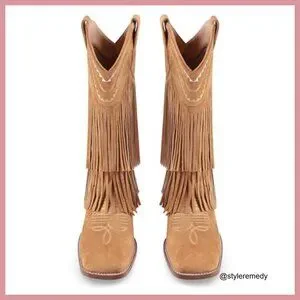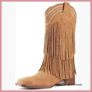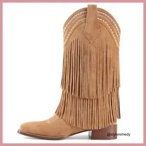 A stylish mid-calf boot featuring a trendy fringe design and a comfortable low block heel. Perfect for adding a touch of Western flair to casual outfits or special occasion looks.