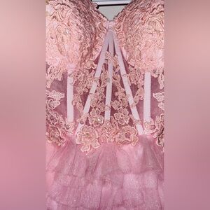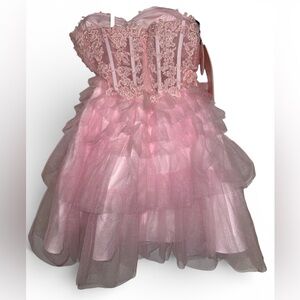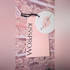 Kissprom Pink Dress Homecoming Gown Prom Dress Sz 4 Formal Sparkle Tulle NWT Strapless-style bustier with delicate lace appliqué. Structured boning and sheer lace panels. Layered tulle skirt with soft ruffles. Feminine pink hue perfect for parties and prom. Brand new smoke free 1 white dog home