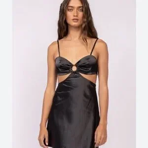 Satin mini dress with a front ring cutout and thin spaghetti straps. Sleek black finish. Flattering fitted bodice and smooth skirt. Perfect for evening wear.