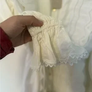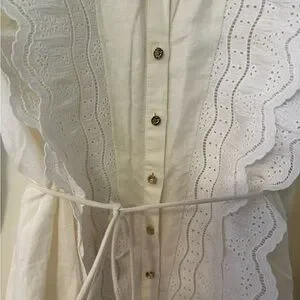 Romantic cream long sleeve dress by KEEPSAKE the Label. Features scalloped eyelet lace yoke and ruffle collar. Button-front with tie waist for shape. Delicate cuff detailing and soft gathered skirt. Feminine and vintage-inspired look.