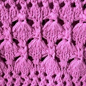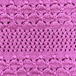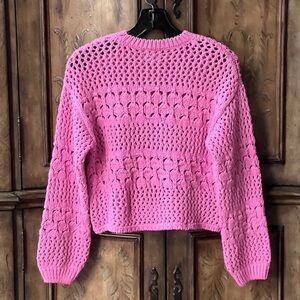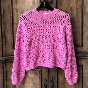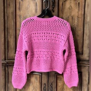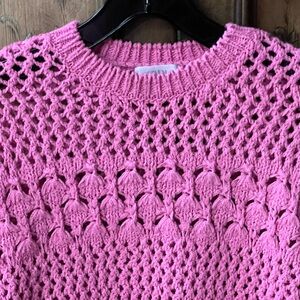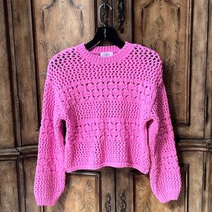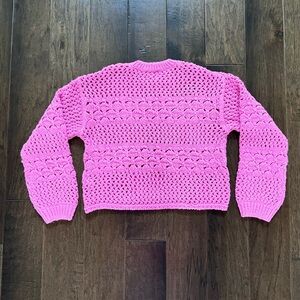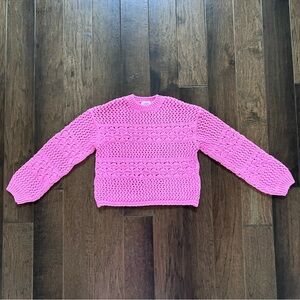 Absolutely gorgeous vibrant pink open-knit sweater with a textured crochet pattern. Crewneck design with long sleeves. Relaxed, slightly cropped silhouette for casual wear. It is marked size 13/14 but it is slightly cropped so it will fit size 10/12 as well. Beautiful, stretchy knit. Excellent condition!