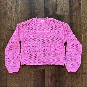 Zara Girls Bright Pink kids Open Knit cropped Crewneck Sweater 10/12 13/14