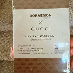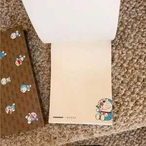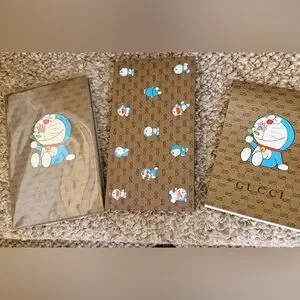 Three Gucci canvas notebooks featuring Doraemon artwork. Brown monogram covers with blue and white character prints. Playful designer stationery set. Ideal for collectors or gifts. The notebook is still in plastic.