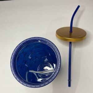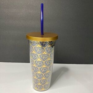 The tumbler features an all over print AOP of Cinderella's Castle and the 50 emblem logo in blue and gold. There is an angled blue straw and a gold lid.