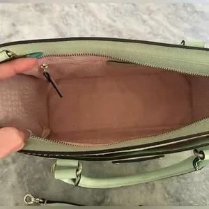 Structured leather satchel with double top handles. Gold-tone logo plaque and hardware accents. Removable shoulder strap for crossbody wear. Clean, polished silhouette for everyday style.
