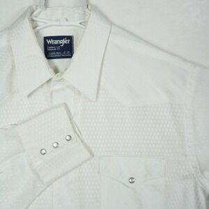 Men's white Wrangler long sleeve western shirt. This Cowboy Cut shirt features a classic regular fit and X-Long Tails for extended coverage. The fabric has an all-over textured pattern and includes two chest pockets with button closures. Single needle tailoring ensures quality construction. Perfect for rodeo events, ranch work, or casual everyday wear.