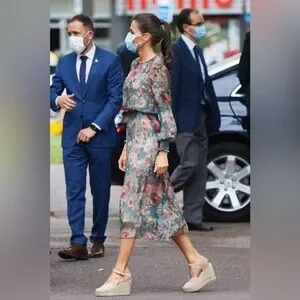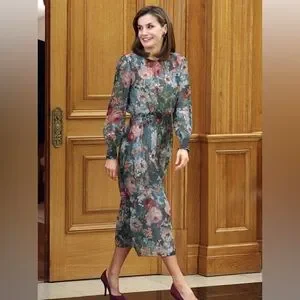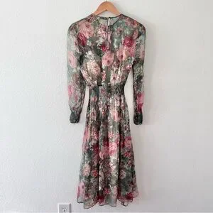 Elegant floral dress with a green background and pink neutral floral print. Champagne satin lining with sheer overlay. Long sleeve with elastic cinched waist. Midi length. Seen on Kate Middleton and Queen Letizia at Royal events. Excellent condition.