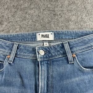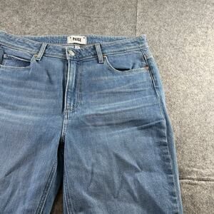 The Paige Jeans Women's 30 Colette Crop Flare Raw Hem Denim is a stylish and versatile pair of jeans perfect for a casual retro boho look. Featuring a solid blue color, high rise, and cropped style, these jeans are both trendy and comfortable. Made from denim fabric with a raw wash, they are machine washable for easy care. The zip and button closure adds practicality to this flattering and fashionable choice for women's wardrobe.