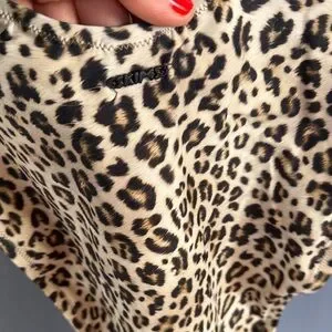 Sleek one-piece swimsuit by SKIMS. Leopard print pattern. Scoop neckline and medium coverage. Stretchy, form-fitting fabric. Bold neutral tones for easy styling.