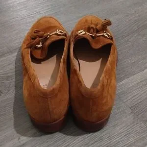 Talbots suede loafers with tassel and metal bit detail. Comfortable low heel and cushioned insole for all-day wear. Versatile camel color pairs well with neutrals and denim.