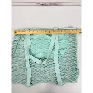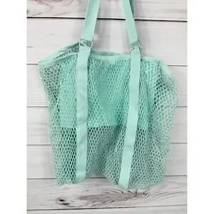 Cotton mesh shopping tote in a refreshing aqua hue. This reusable bag features a durable mesh construction with comfortable fabric handles, perfect for carrying groceries or beach essentials. Ideal for farmers market trips, beach outings, or everyday errands.