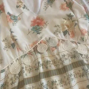 Light cream blouse with delicate floral print. Soft peach blossoms add warmth. Teal leaves create contrast. Feminine and breezy feel. Easy to pair with skirts or jeans.