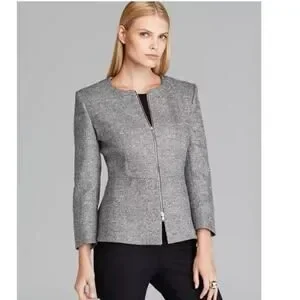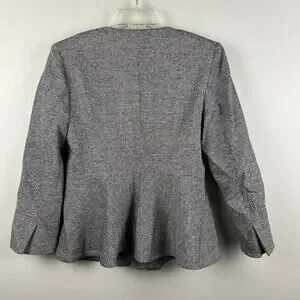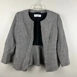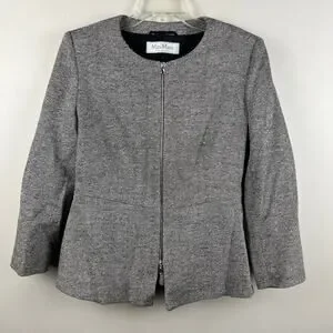MaxMara Italy Gray Tweed Virgin Wool Silk Full Zip Collarless Peplum Blazer