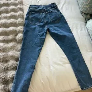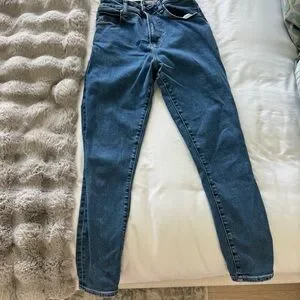High-rise fit with a tapered leg. Classic blue denim with slight stretch. Clean five-pocket styling. Versatile for casual outfits.