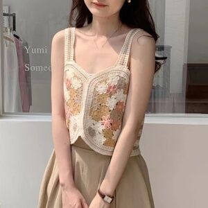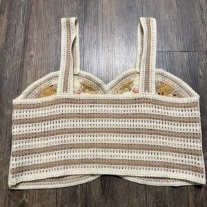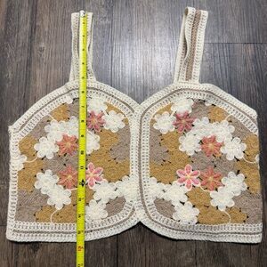 Gorgeous crochet stitch knit floral embroidered cami crop tank top sleeveless. Label and size tag have been cut off. According to measurements it’s a size M.