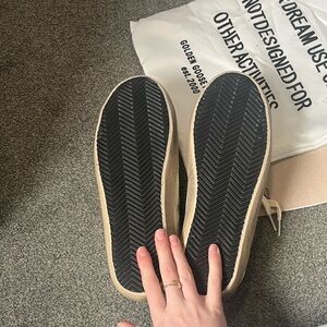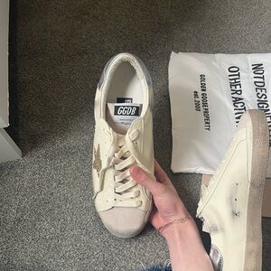 Very good replica. Classic low-top Golden Goose sneakers. Cream leather upper with subtle grey suede toe. Metallic silver heel tab and glitter star detail. Lace-up style with signature worn-in look. Versatile casual sneaker for everyday wear. Great copy. I am a size 8 women’s and these were around a size and half too big.