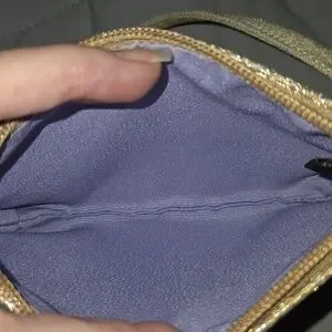 Stylish gold metallic wristlet with subtle jacquard pattern. Lightweight and versatile for evening or daytime use. Secure zip closure and wrist strap for easy carrying. Elegant gold finish adds a polished look. Comes with original hang tag.