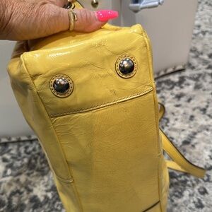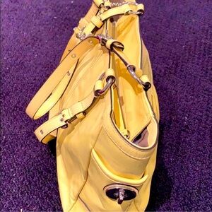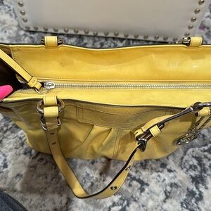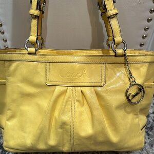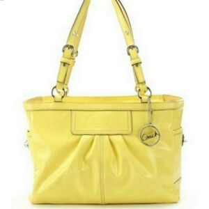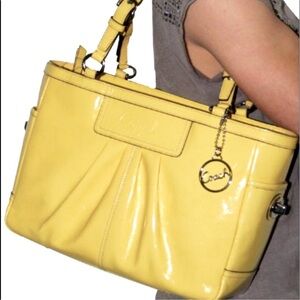 RARE: This Coach East West Gallery Patent Leather Tote Bag in a vibrant yellow, described as canary yellow. This popular Coach style is known for its blend of classic design and practical features, making it a versatile accessory.