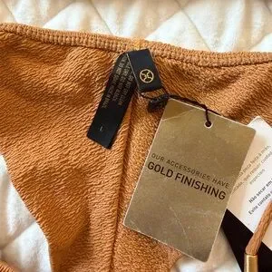 Classic triangle string bikini in warm brown. Soft textured fabric with adjustable ties for a customizable fit. Lightweight and comfortable for all-day beach or pool wear. Brown color complements sun-kissed skin tones.