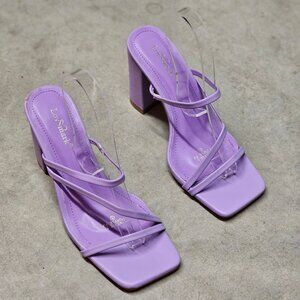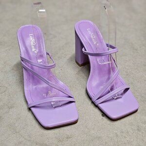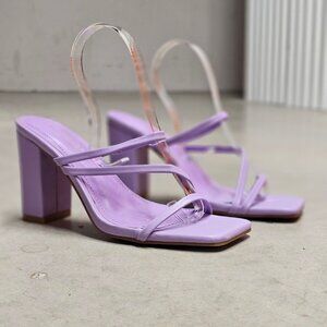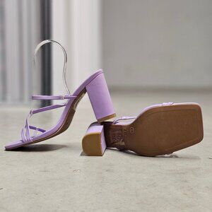 Elegant purple block heel sandals with strappy accents offering a modern, polished look for formal or casual occasions.