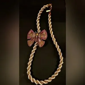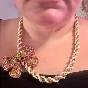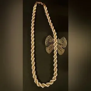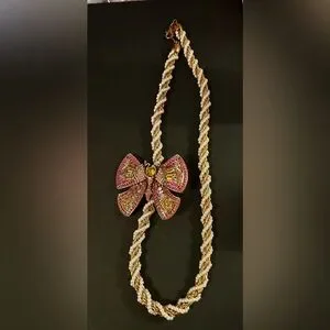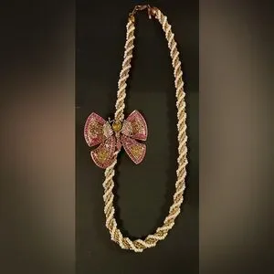 Charming butterfly Broach with pink and gold details. Paired on a vintage “Casual Corner” necklace. One of a kind and you can remove the broach if you want to wear either on its own