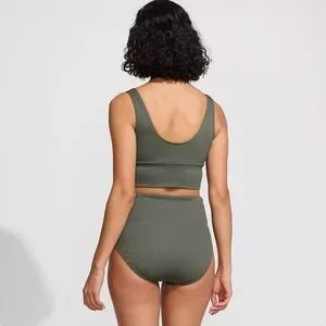 Two-piece ribbed swim set with a supportive scoop tank top. High-waist bottom offers moderate coverage. Stretchy fabric for a comfortable fit. Timeless olive green shade.