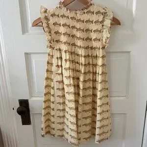 Cream dress with an all-over fish print. Smocked bodice with ruffle sleeves. Pink trim at the neckline. Lightweight and breezy for play.