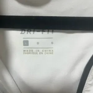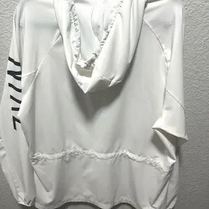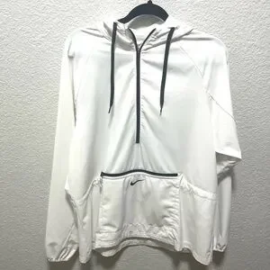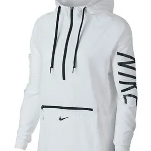 Nike women's white pullover hoodie with black drawcords and logo accents. Front zip pocket for small items. Bold black 'NIKE' branding down sleeve for sporty style.