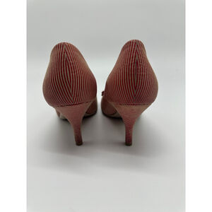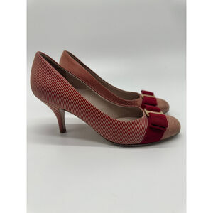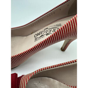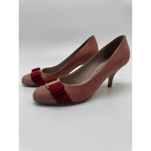 Keywords: Salvatore Ferragamo Vara heels, Vara bow pumps size 5, Ferragamo striped heels, designer work pumps, Italian leather heels, classic low heel shoes, quiet luxury shoes, red bow pumps, Ferragamo size 5, made in Italy heels, office shoes, wedding guest heels, timeless designer shoes.