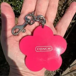 Design: Features a five-petal floral motif in various shades of pink, white, and a deep burgundy center with the script "Coach" logo.