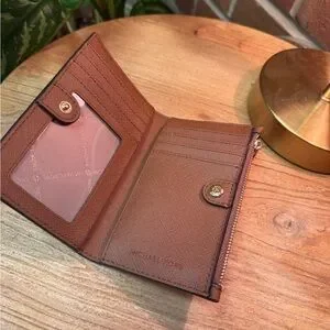 Slim Saffiano leather wallet. Front slots, interior card slots and ID holder, plus zip pocket for change. Gold-tone Michael Kors logo accent. Compact and refined for daily use. Great condition.