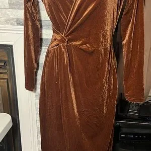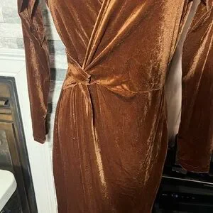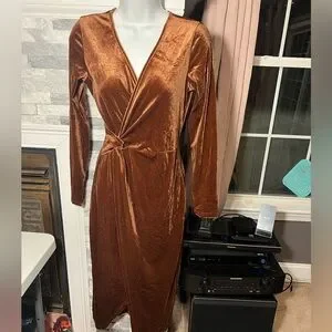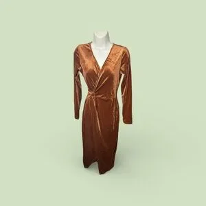 Rich, soft velvet meets a curve-flattering silhouette. This brown wrap-style midi dress features a deep V neckline, long sleeves, and ruched waist with elastic for a snatched yet comfortable fit. Perfect for fall and winter events when you want to look polished and irresistible.