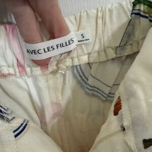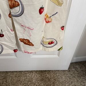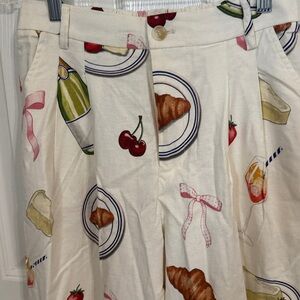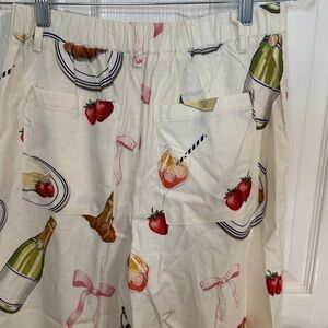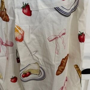 Cream maxi skirt featuring playful breakfast and pastry motifs. Lightweight, flowy fabric with a relaxed silhouette. Comfortable waistband for easy wear. Charming print adds a whimsical touch.