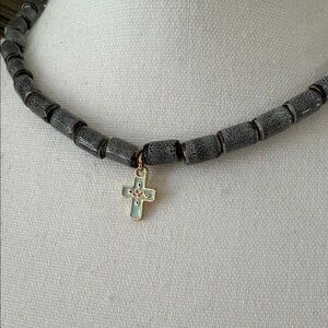 Elegant gray beaded necklace featuring a silver cross pendant. Perfect for adding a touch of sophistication to any outfit.
