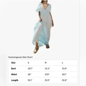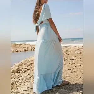Breezy light blue V-neck maxi dress with tiered skirt. Soft, flowing fabric for comfortable all-day wear. Feminine flutter sleeves and a relaxed silhouette for easy styling. Perfect for warm-weather outings and beach days.