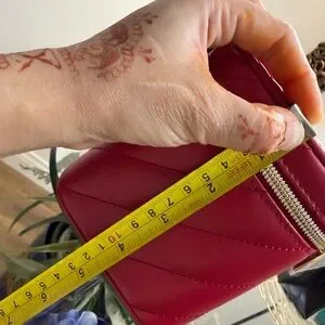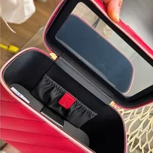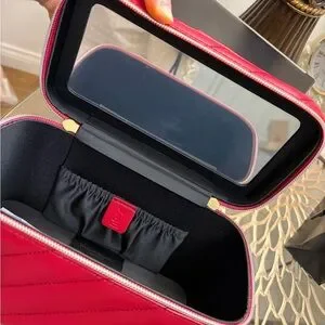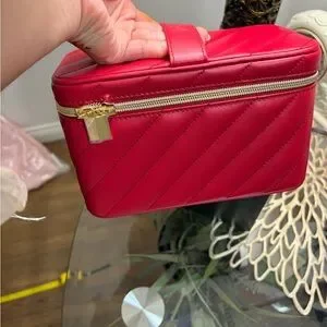 Structured quilted cosmetic case in bold red. Gold-tone zipper and logo accents. Top handle for easy carrying. Interior organization for makeup and small items. Luxurious finish and polished look.