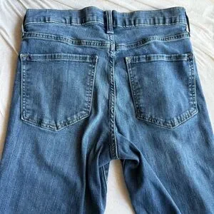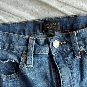 Banana Republic high-rise slim jeans in blue denim. Classic five-pocket styling with button closure. Subtle contrast stitching for a timeless look.
