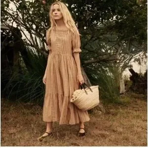 DOEN Elodie Midi Dress in the Meringue Orange plaid. Size xs. Square neckline, romantic puff sleeves, and a tiered midi silhouette. Made from 100% cotton.Classic DOEN feminine fit with that effortless, timeless vibe.